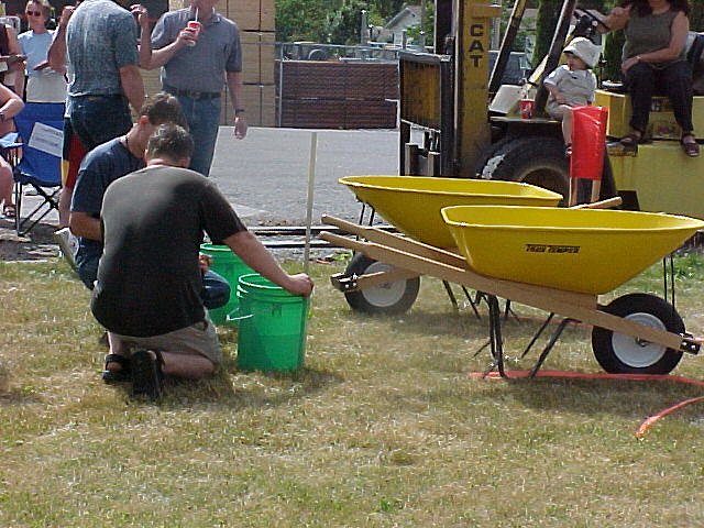 The objective was to load a bucket of water into a wheelbarrow and wheel around the course losing a minimal amount of water. It was a trip, though, filled with many liquid hazards.